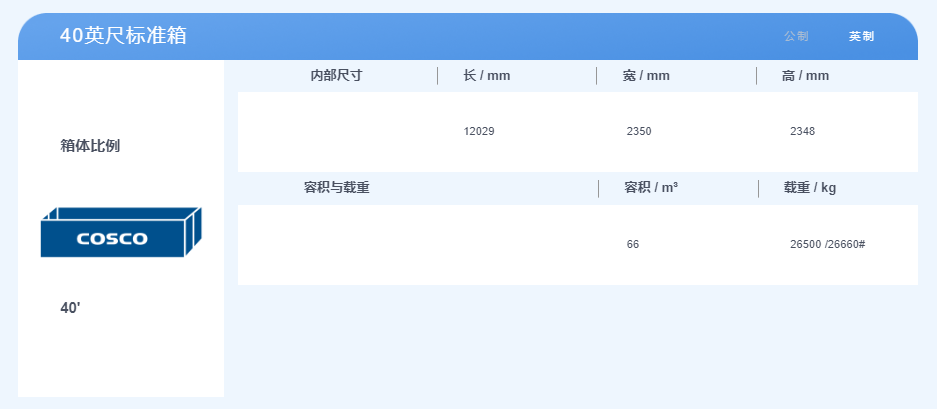 40英尺集裝箱,體積是2.3米寬,2.3米高,12米長(zhǎng),最大貨物載重約28噸。